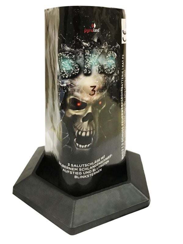 3-SCHLAG-BOMBENROHR 30mm mit silbernem Schlangenschweifaufstieg, Feuertopf mit blutroten Blinksternen und heftigem Silberblitz.